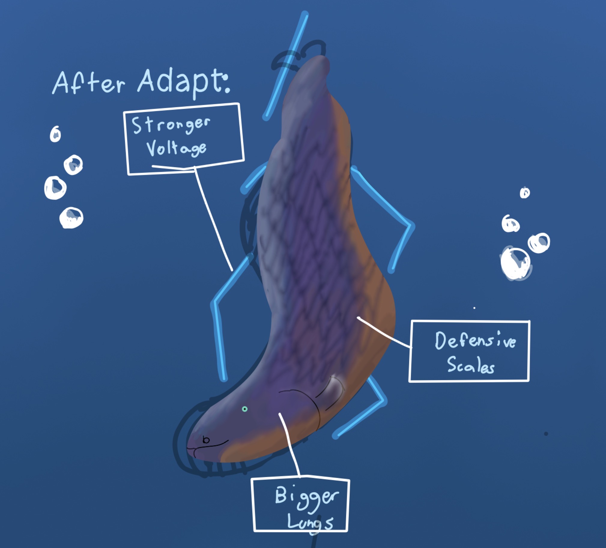 Electric Eels are not actually Eels, but freshwater knife fish from South America. They can use their special organs to emit high voltage shocks to defend themselves or hunt prey. THey live in Rainforests since their bodies are adapted to shallow and murky water with little oxygen. If electric Eels were to be put in a more dry savannah/desert biome due to global warming, they would somewhat be suited there. However having a higher voltage shock for hunting prey, scales for armor to defend from predators, and a better lung capacity so they can stay underwater would help them live better.
