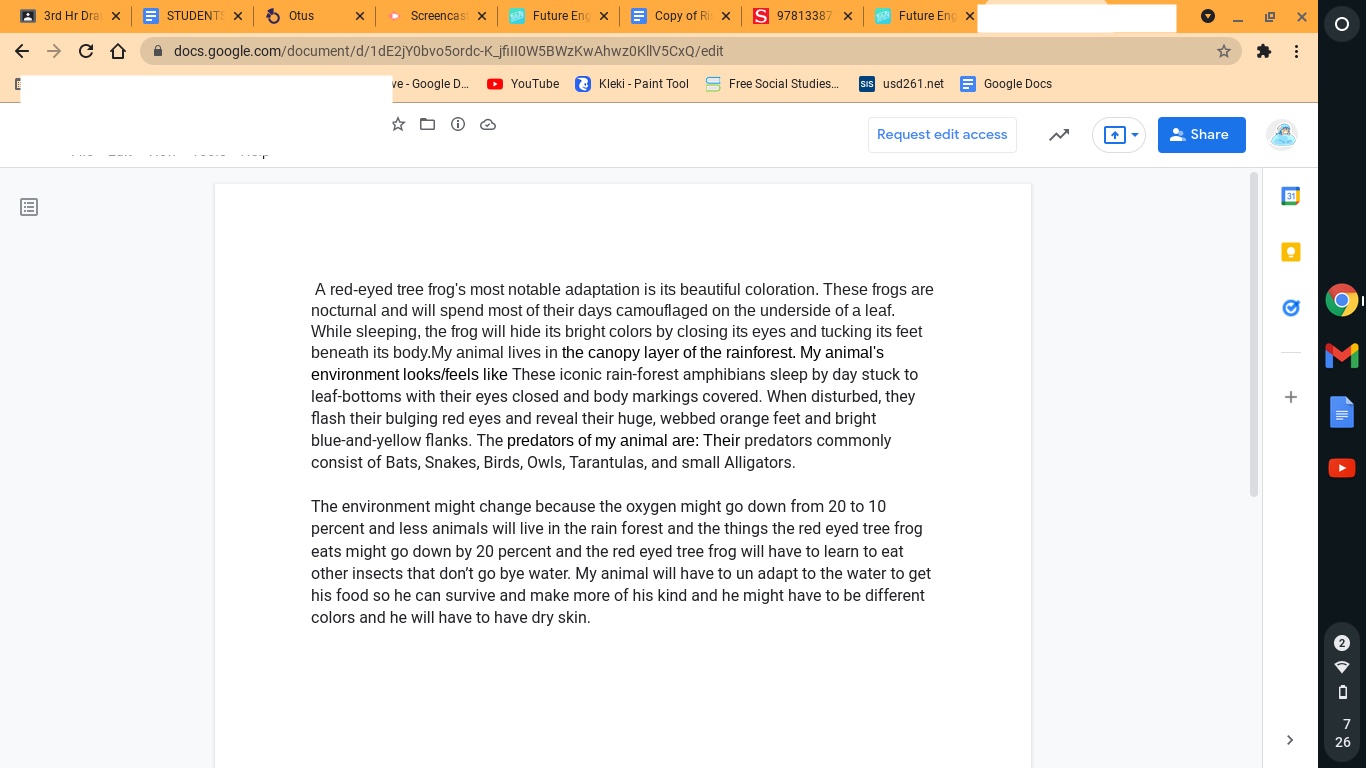 It talks about my animal and what i dose and how it survives and what it might look in a 100 years.